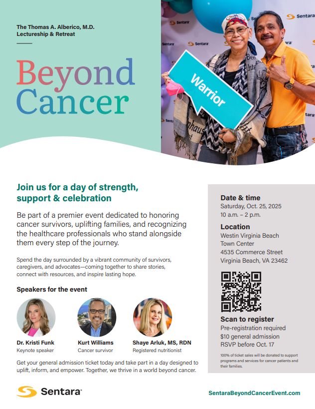 Sentara's Beyond Cancer Saturday, October 25, 2025 10:00 AM 2:00 PM Westin Virginia Beach Town Center 4535 Commerce Street Virginia Beach, VA, 23462 United States (map) Google Calendar ICS https://www.eventbrite.com/e/beyond-cancer-the-thomas-a-alberico-md-lectureship-and-retreat-tickets-1434828423439?aff=oddtdtcreator
